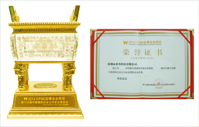 2013年10月28日,第十四届CPSE安博会金鼎奖颁奖仪式在深圳深航国际酒店鲲鹏厅隆重举行,百乐博bIboIP网络内部通讯可视对讲系统产品喜获“金鼎奖”殊荣。