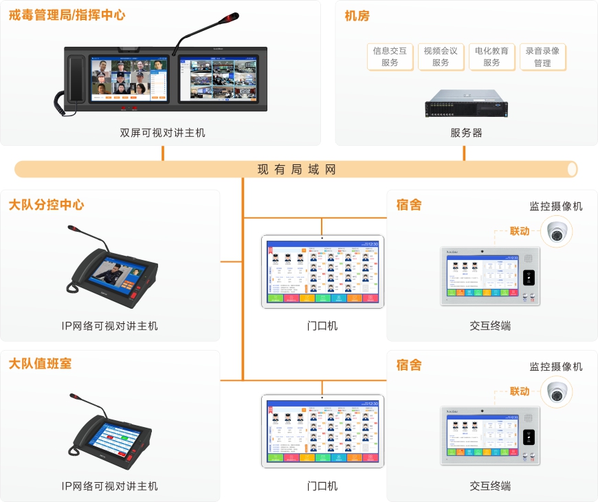 1)当宿舍内学员呼叫时,大队监控室或分控中心(夜间)需能及时收到呼叫信息,并可以明确获知呼叫的宿舍号,进行视频通话。